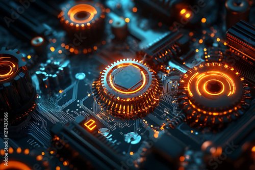 technology background featuring an electronic circuit board, processor, and gears creates a unique and dynamic backdrop for your business