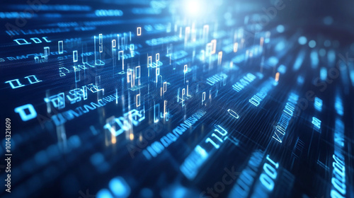 Technology background with binary code and blue light effects, Close-up of blue-tinted computer code on a screen, implying cybersecurity or programming concept.