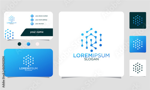 technology hexagon molecule R initials logo, with gradient colors business card template