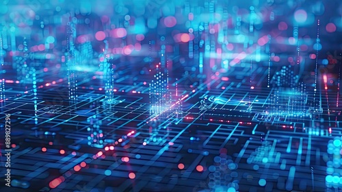 Technology metaverse concept with interconnected dots forming a smart city grid, showcasing digital connectivity