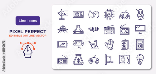 technology outline icons set. thin line icons such as wind power, big joystick, plugs, battery level, international passport, sega gamepad, circuit board, led lamp vector.