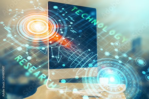 Technology theme drawing and table with computer. Multi exposure. Concept of information.