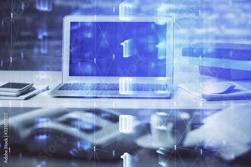 Technology theme drawing and table with computer. Multi exposure. Concept of information.