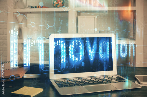 Technology theme drawing and work space with computer. Multi exposure. Concept of innovation.