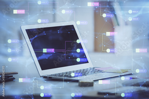 Technology theme drawing and work space with computer. Multi exposure. Concept of innovation.