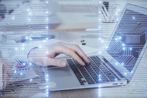Technology theme hologram with man working on computer on background. High tech concept. Double exposure.