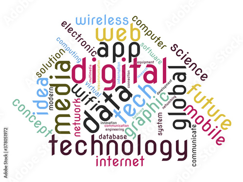 Technology word cloud. Innovative concept. Collage made of words. Vector colorful illustration. Isolated on white background.