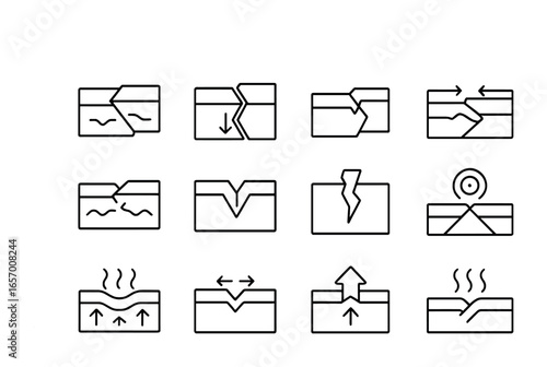 Tectonic Activity Icons. Outline vector icons of tectonic plate activity: plate boundary, subduction zone,