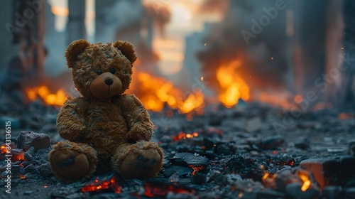 Teddy bear toy over a burned city, destruction of the consequences of a military conflict made with AI generative technology
