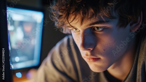 Teenage boy focused on computer screen in dimly lit room with soft blue light and intense expression