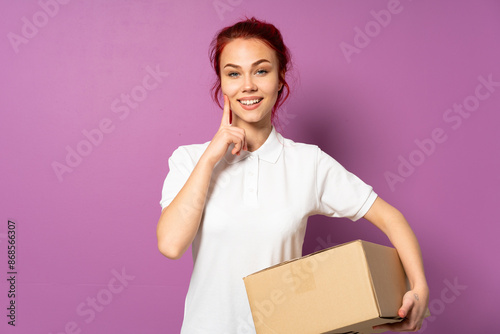 Teenager delivery girl isolated on purple background smiling with a happy and pleasant expression