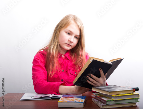 teenager girl sitting at a table in front of her large pile of books. schoolgirl reading a book and doing homework