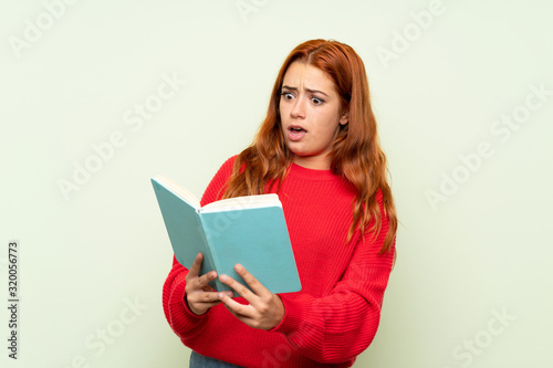 Teenager redhead girl with sweater over isolated green background holding and reading a book