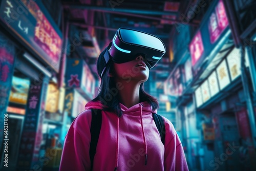Teenager wearing virtual reality glasses in the city. Technology and entertainment concept.
