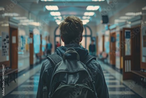 Teenager with Backpack Walking Through School Hallway in Focused Thought