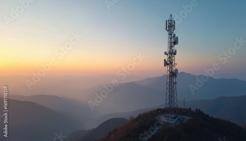 Telecommunication tower on mountain peak at sunset. Aerial view of wireless infrastructure transmitting signal across scenic landscape. Evening illumination on antennae, antennas against hazy sky.