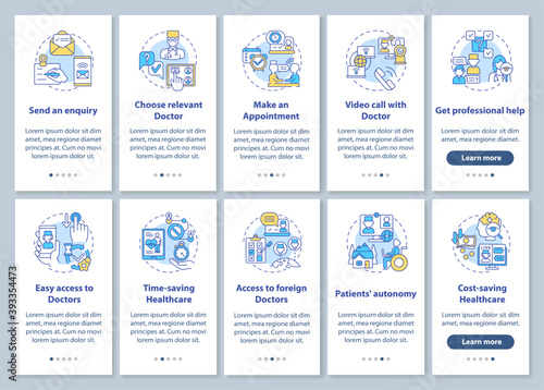 Telemedicine onboarding mobile app page screen with concepts set. Futuristic health care system walkthrough 10 steps graphic instructions. UI vector template with RGB color illustrations