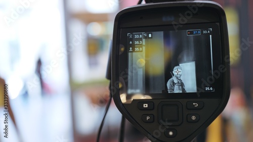 Temperature check at a supermarket, grocery store with a thermal imaging camera installed. Image monitoring scanner to monitor the body temperature of visitor customer. Coronavirus pandemic outbreak.