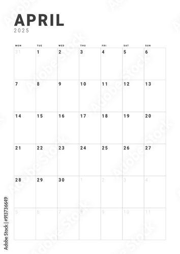 Template design of Monthly Calendar on April 2025. Vector layout grid of calendar with week start Monday. Page for size A4 -21x29.7 cm.