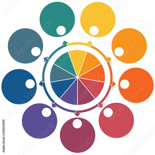 Template for infographics, colorful circle diagram 9 positions for cyclic processes, step by step