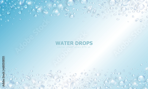 Template of blue banner with realistic pure water drops frame and space for text. Wallpaper with 3d shiny dew, water blobs. Blank backdrop with rain droplets or aqua splashes and water texture