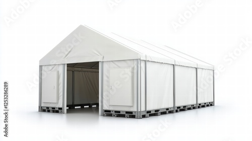 Temporary Structure: A modern, white event tent stands ready, inviting and versatile, suggesting shelter or a gathering space against a clean background.