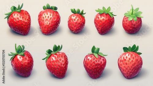 Ten vibrant, glossy strawberries in various angles, displayed against a neutral backdrop