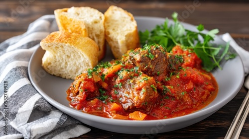 tender beef stew in tomato pelati sauce, with onions and carrots, served on a plate with fresh bread