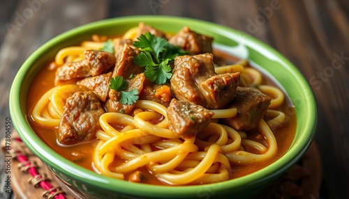 Tender beshbarmak, meat & noodles in a vibrant green bowl, garnished with parsley, beshbarmak, food styling