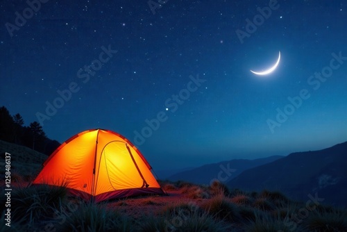 Tent under the starry sky with constellations and a crescent moon, sky, constellation, crescent moon