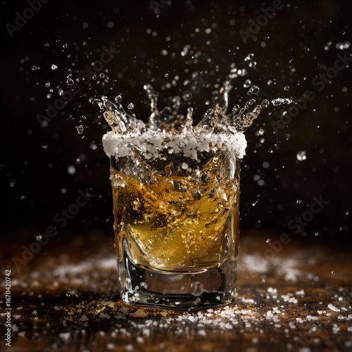 Tequila splash crystallizing in mid-air with salt refracting smiles, 1/8000s macro frozen motion with droplet corona, cocktail art photography