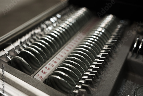 Test glasses phoropter with lens set for eye vision testing or examinations in clinic - refractor used for eye exam