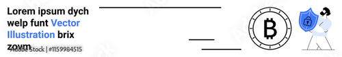 Text block, Bitcoin symbol, and a person holding a shield with a lock. Ideal for fintech, security, blockchain, digital currency, technology, finance, and investment themes. Landing page
