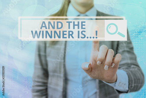 Text sign showing And The Winner Is. Business photo showcasing announcing who got first place at competition or exam