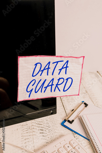 Text sign showing Data Guard. Business photo text analysisage databases to survive disasters and data corruptions Note paper taped to black computer screen near keyboard and stationary