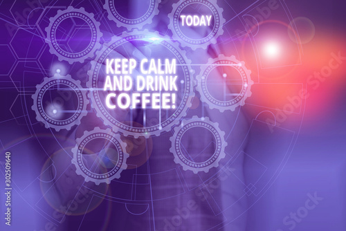 Text sign showing Keep Calm And Drink Coffee. Business photo showcasing encourage demonstrating to enjoy caffeine drink and relax Picture photo system network scheme modern technology smart device