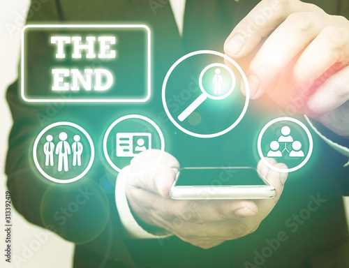 Text sign showing The End. Business photo showcasing Final part of play relationship event movie act Finish Conclusion