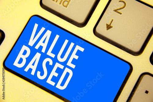 Text sign showing Value Based. Conceptual photo Considering the product worth in satisfying the customer Keyboard blue key Intention create computer computing reflection document