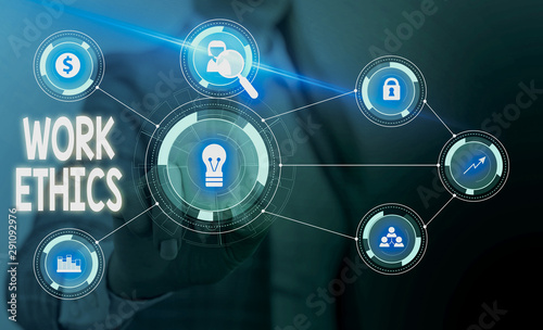 Text sign showing Work Ethics. Business photo showcasing A set of values centered on the importance of doing work Woman wear formal work suit presenting presentation using smart device