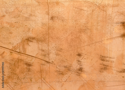 Texture of an old, dirty, heavily scratched and stained copper sheet as a background
