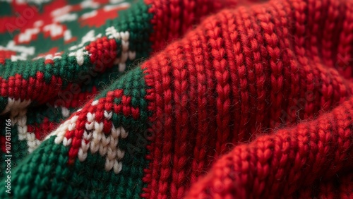 texture of chunky knit wool fabric, with a visible weave pattern in festive red, green, and white tones.