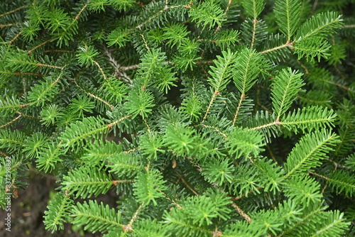 texture of conifer branches as background, sustainability concept, young needles as background close-up