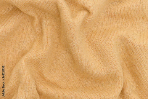 Texture of crumpled woolen fabric of yellow ocher color. Merino wool, cashmere concept. Background for your mockup