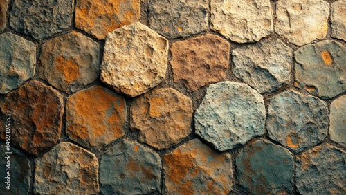 Texture of hexagonal stone tiles arranged closely showcasing varying colors and textures ideal for background design