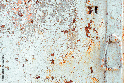Texture of rusty metal door with handle, painted white which became orange from rust in some places. Horizontal texture of cracked white paint