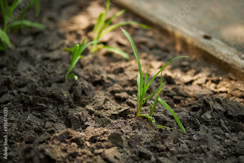 Texture of the earth. Black soil. The texture of the black fertile layer of the earth closeup. Sprouts of grass in the ground.