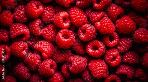 Texture with lots of ripe raspberries. Background design with fresh red berries. Generative AI.