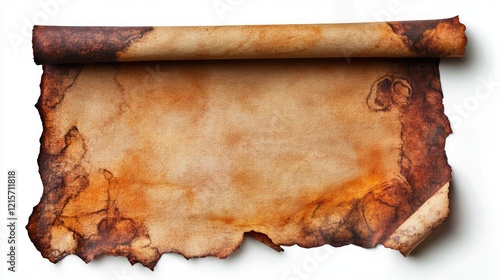 Textured aged parchment paper with dye stains and curled edges providing ample copyspace for creative text placement.