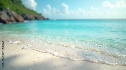 Textured Caribbean shore, blurred transparent turquoise water, springtime light, tranquil and photorealistic, no people.