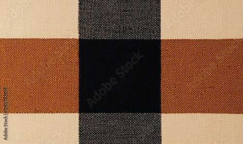Textured fabric with a modern plaid pattern in earthy tones on a neutral background.